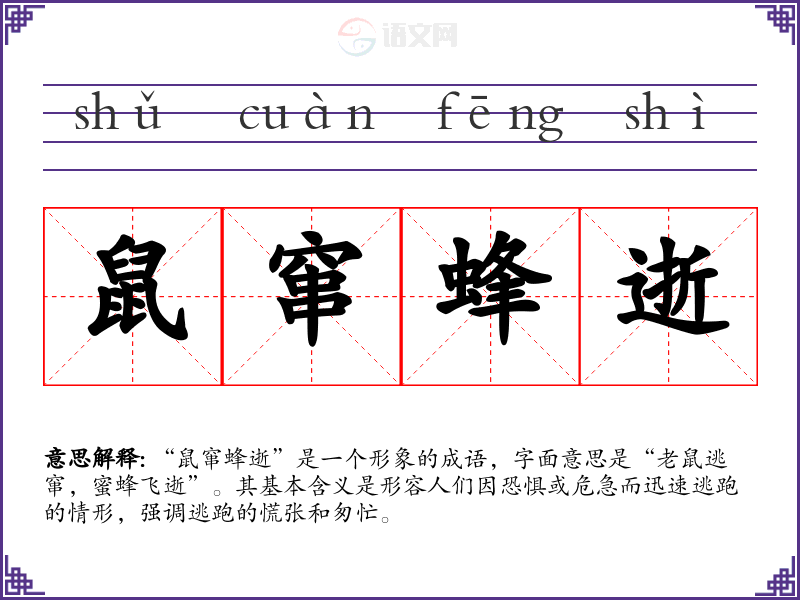 通过对“鼠窜蜂逝”的学,我理解到这个成语不仅仅是描述一种行为,更是一种对人性在面对危机时反应的深刻观察。在语言学和表达中,掌握这样的成语能够增强表达的生动性和形象性,有助于更好地传达情感与意图。