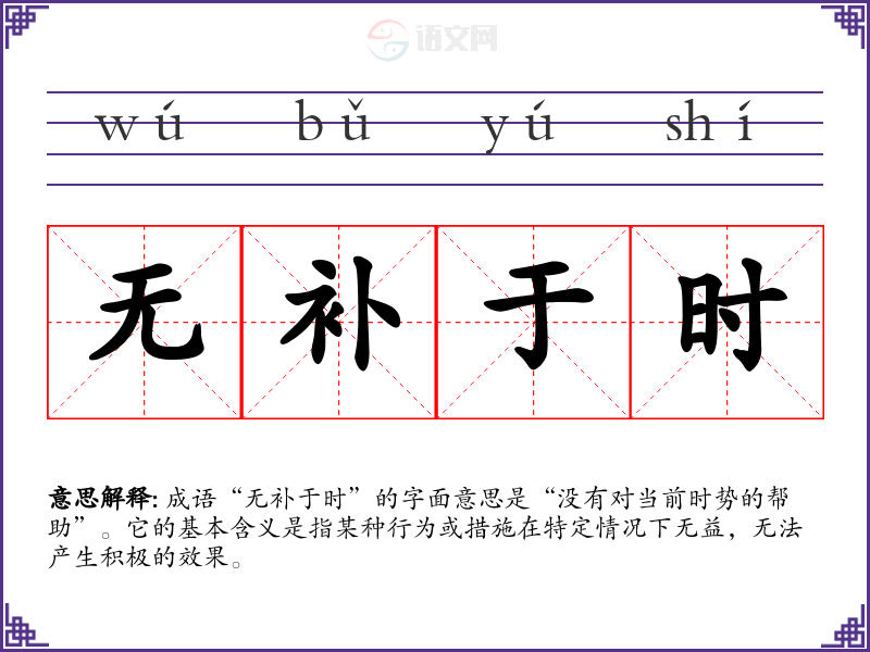 成语“无补于时”的字面意思是“没有对当前时势的帮助”。它的基本含义是指某种行为或措施在特定情况下无益,无法产生积极的效果。