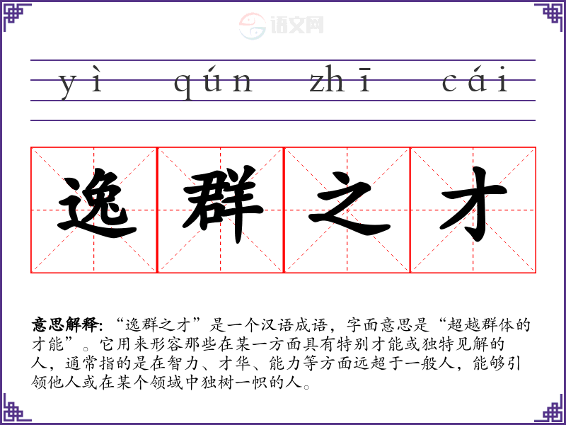 “逸群之才”是一个汉语成语,字面意思是“超越群体的才能”。它用来形容那些在某一方面具有特别才能或独特见解的人,通常指的是在智力、才华、能力等方面远超于一般人,能够引领他人或在某个领域中独树一帜的人。