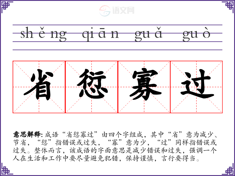 成语“省愆寡过”由四个字组成,其中“省”意为减少、节省,“愆”指错误或过失,“寡”意为少,“过”同样指错误或过失。整体而言,该成语的字面意思是减少错误和过失,强调一个人在生活和工作中要尽量避免犯错,保持谨慎,言行要得当。