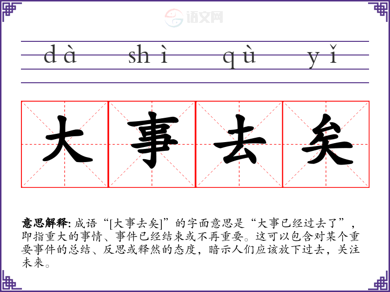 成语“[大事去矣]”的字面意思是“大事已经过去了”,即指重大的事情、已经结束或不再重要。这可以包含对某个重要的总结、反思或释然的态度,暗示人们应该放下过去,关注未来。