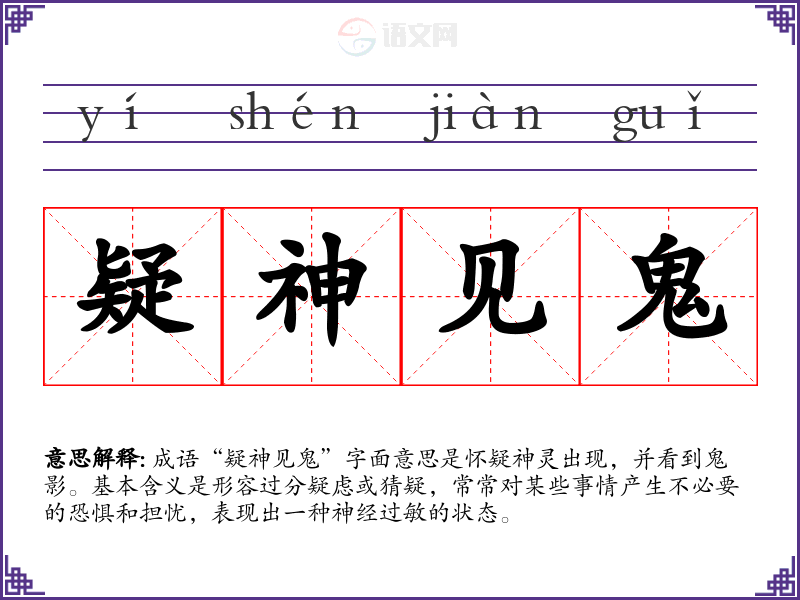 成语“疑神见鬼”字面意思是怀疑神灵出现,并看到鬼影。基本含义是形容过分疑虑或猜疑,常常对某些事情产生不必要的恐惧和担忧,表现出一种神经过敏的状态。