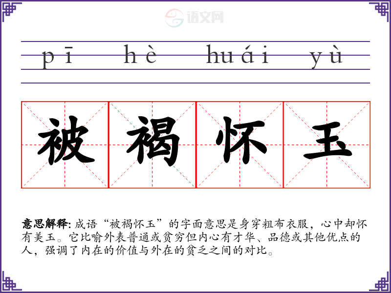 成语“被褐怀玉”的字面意思是身穿粗布衣服,心中却怀有美玉。它比喻外表普通或贫穷但内心有才华、品德或其他优点的人,强调了内在的价值与外在的贫乏之间的对比。