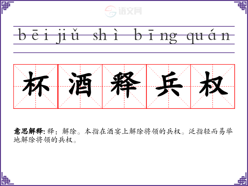 释:解除。本指在酒宴上解除将领的兵权。泛指轻而易举地解除将领的兵权。
