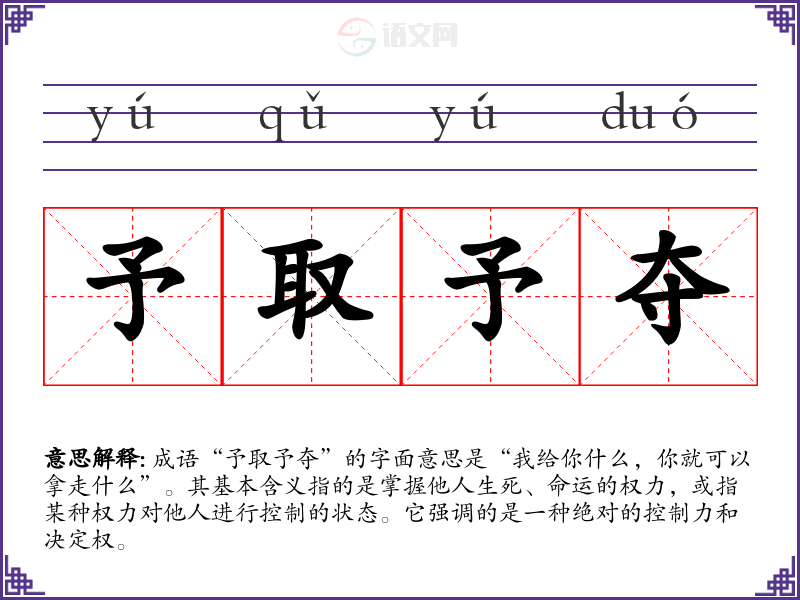成语“予取予夺”的字面意思是“我给你什么,你就可以拿走什么”。其基本含义指的是掌握他人生死、命运的权力,或指某种权力对他人进行控制的状态。它强调的是一种绝对的控制力和决定权。