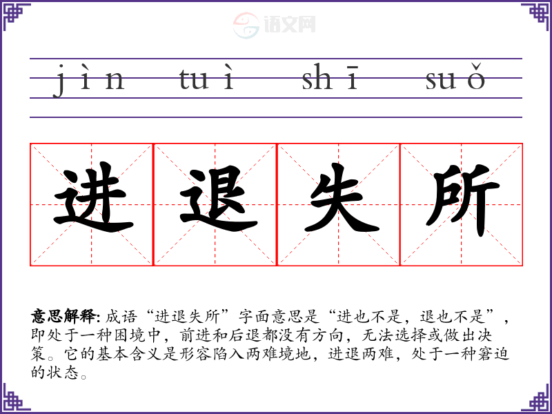 成语“进退失所”字面意思是“进也不是,退也不是”,即处于一种困境中,前进和后退都没有方向,无法选择或做出决策。它的基本含义是形容陷入两难境地,进退两难,处于一种窘迫的状态。