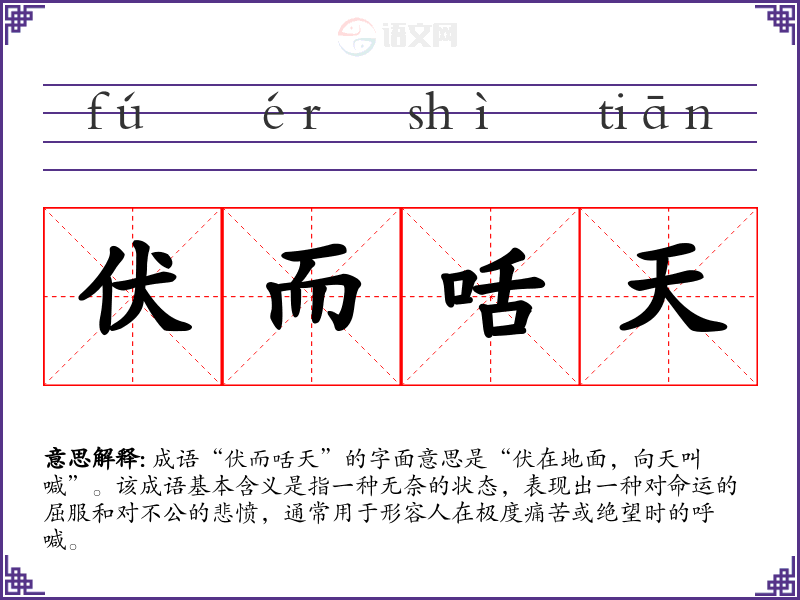 成语“伏而咶天”的字面意思是“伏在地面,向天叫喊”。该成语基本含义是指一种无奈的状态,表现出一种对命运的屈服和对不公的悲愤,通常用于形容人在极度痛苦或绝望时的呼喊。
