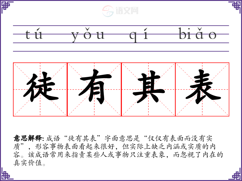 成语“徒有其表”字面意思是“仅仅有表面而没有实质”,形容事物表面看起来很好,但实际上缺乏内涵或实质的内容。该成语常用来指责某些人或事物只注重表象,而忽视了内在的真实价值。