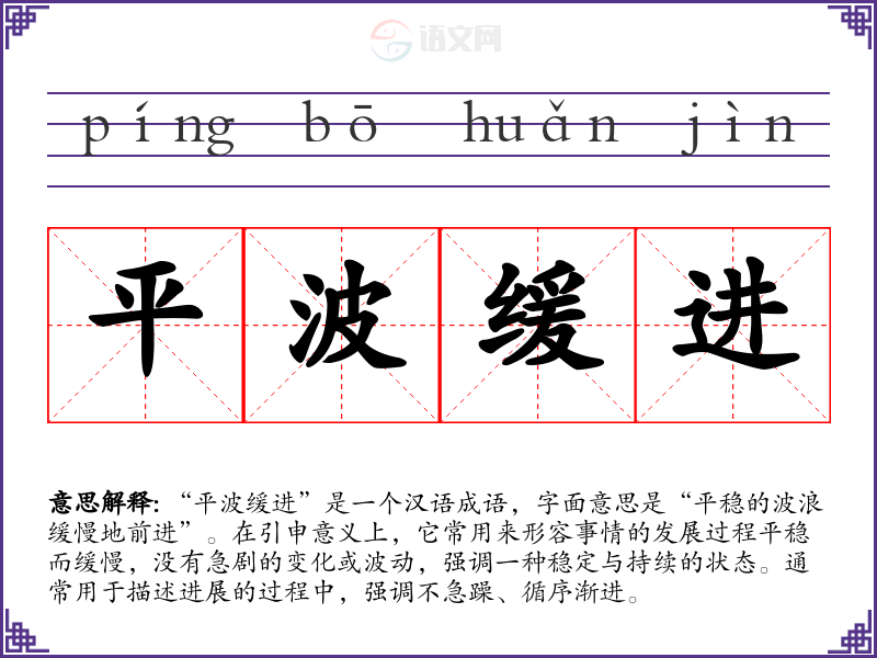 “平波缓进”给人一种安定、踏实的感觉,传达出稳步前进的积极态度。它让我联想到在追求目标时,保持耐心和坚持的重要性。这个成语提醒我们,成功往往不是一蹴而就的,而是需要时间和努力的积累。