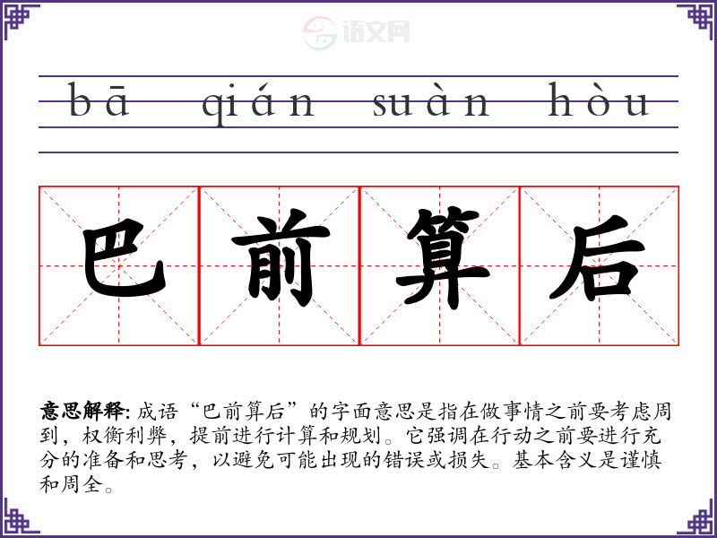 成语“巴前算后”的字面意思是指在做事情之前要考虑周到,权衡利弊,提前进行计算和规划。它强调在行动之前要进行充分的准备和思考,以避免可能出现的错误或损失。基本含义是谨慎和周全。