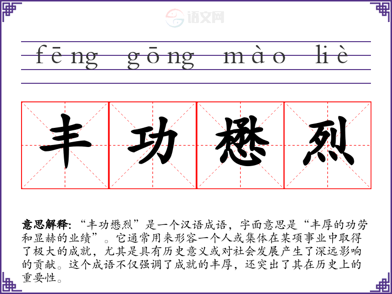 在**文化中,丰功懋烈不仅是对个人成就的认可,也反映了社会对贡献者的尊重。特别是在历史的语境中,人们常常通过书写历史、传颂故事来纪念那些做出重大贡献的人物,以激励社会的积极向上。因此,这一成语在现代社会依然适用,尤其是在强调社会责任感和奉献精神的背景下。