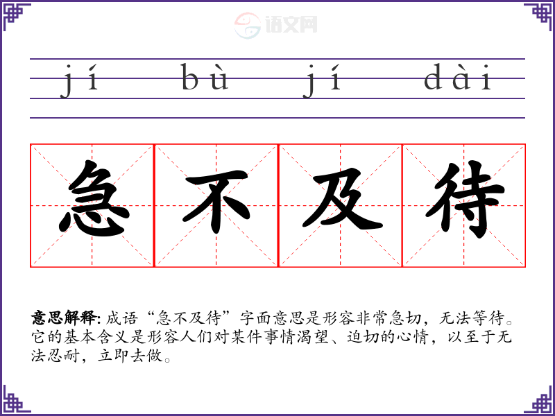 成语“急不及待”字面意思是形容非常急切,无法等待。它的基本含义是形容人们对某件事情渴望、迫切的心情,以至于无法忍耐,立即去做。