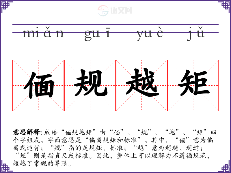 成语“偭规越矩”由“偭”、“规”、“越”、“矩”四个字组成。字面意思是“偏离规矩和标准”。其中,“偭”意为偏离或违背;“规”指的是规矩、标准;“越”意为超越、超过;“矩”则是指直尺或标准。因此,整体上可以理解为不遵循规范,超越了常规的界限。