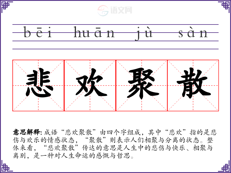 成语“悲欢聚散”由四个字组成,其中“悲欢”指的是悲伤与欢乐的情感状态,“聚散”则表示人们相聚与分离的状态。整体来看,“悲欢聚散”传达的意思是人生中的悲伤与快乐、相聚与离别,是一种对人生命运的感慨与哲思。