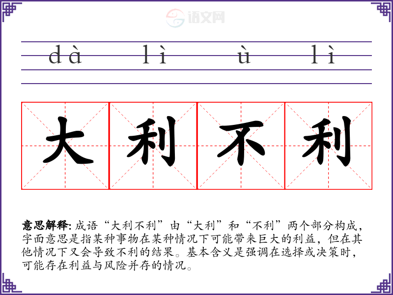 成语“大利不利”由“大利”和“不利”两个部分构成,字面意思是指某种事物在某种情况下可能带来巨大的利益,但在其他情况下又会导致不利的结果。基本含义是强调在选择或决策时,可能存在利益与风险并存的情况。