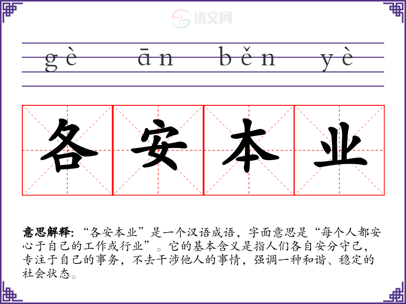 “各安本业”是一个汉语成语,字面意思是“每个人都安心于自己的工作或行业”。它的基本含义是指人们各自安分守己,专注于自己的事务,不去干涉他人的事情,强调一种和谐、稳定的社会状态。