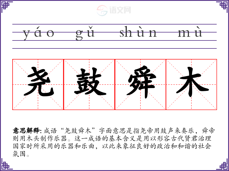 成语“尧鼓舜木”字面意思是指尧帝用鼓声来奏乐,舜帝则用木头制作乐器。这一成语的基本含义是用以形容古代贤君治理国家时所采用的乐器和乐曲,以此来象征良好的政治和和谐的社会氛围。