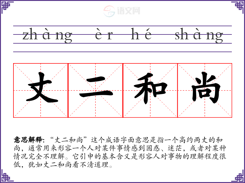 “丈二和尚”这个成语字面意思是指一个高约两丈的和尚,通常用来形容一个人对某件事情感到困惑、迷茫,或者对某种情况完全不理解。它引申的基本含义是形容人对事物的理解程度很低,犹如丈二和尚看不清道理。