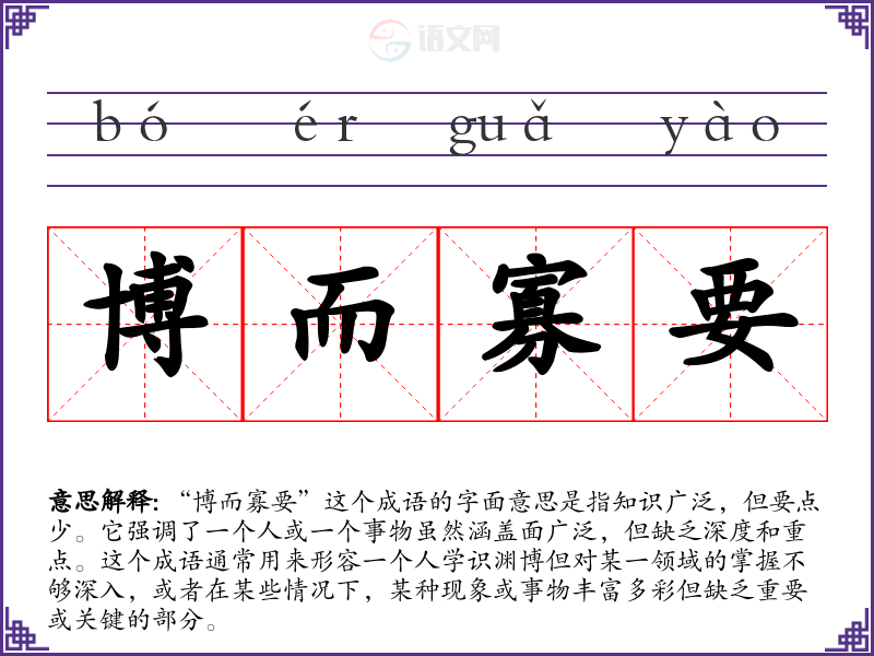 “博而寡要”这个成语的字面意思是指知识广泛,但要点少。它强调了一个人或一个事物虽然涵盖面广泛,但缺乏深度和重点。这个成语通常用来形容一个人学识渊博但对某一领域的掌握不够深入,或者在某些情况下,某种现象或事物丰富多彩但缺乏重要或关键的部分。