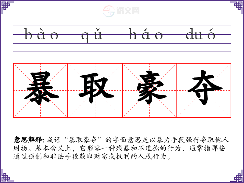 成语“暴取豪夺”的字面意思是以暴力手段强行夺取他人财物。基本含义上,它形容一种残暴和不道德的行为,通常指那些通过强制和非法手段获取财富或权利的人或行为。