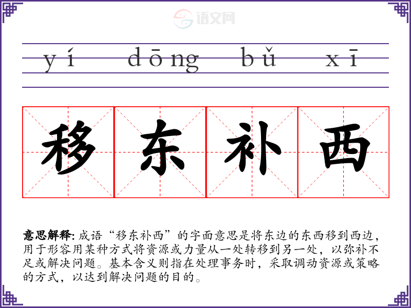 成语“移东补西”的字面意思是将东边的东西移到西边,用于形容用某种方式将资源或力量从一处转移到另一处,以弥补不足或解决问题。基本含义则指在处理事务时,采取调动资源或策略的方式,以达到解决问题的目的。