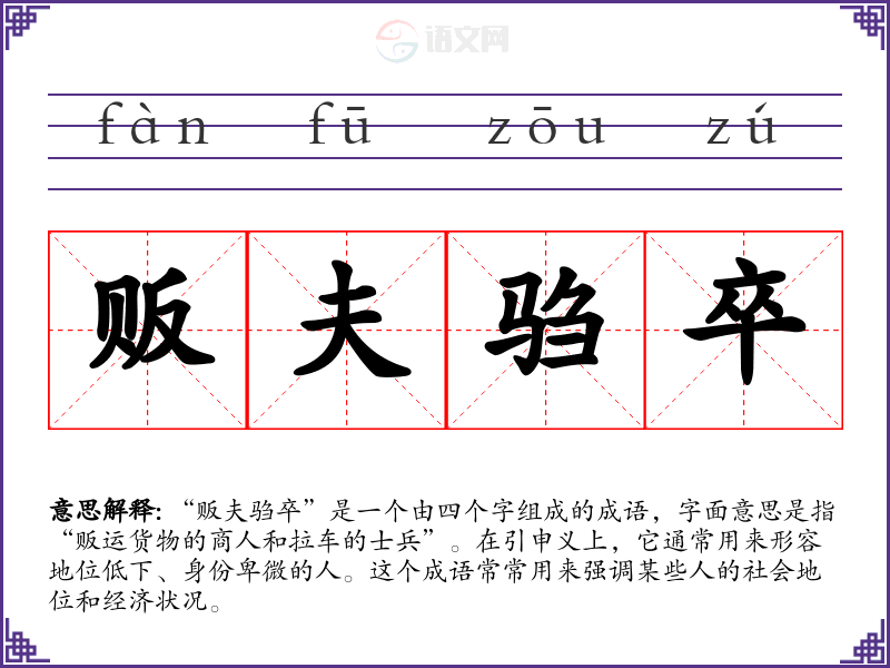 “贩夫驺卒”是一个由四个字组成的成语,字面意思是指“贩运货物的商人和拉车的士兵”。在引申义上,它通常用来形容地位低下、身份卑微的人。这个成语常常用来强调某些人的社会地位和经济状况。