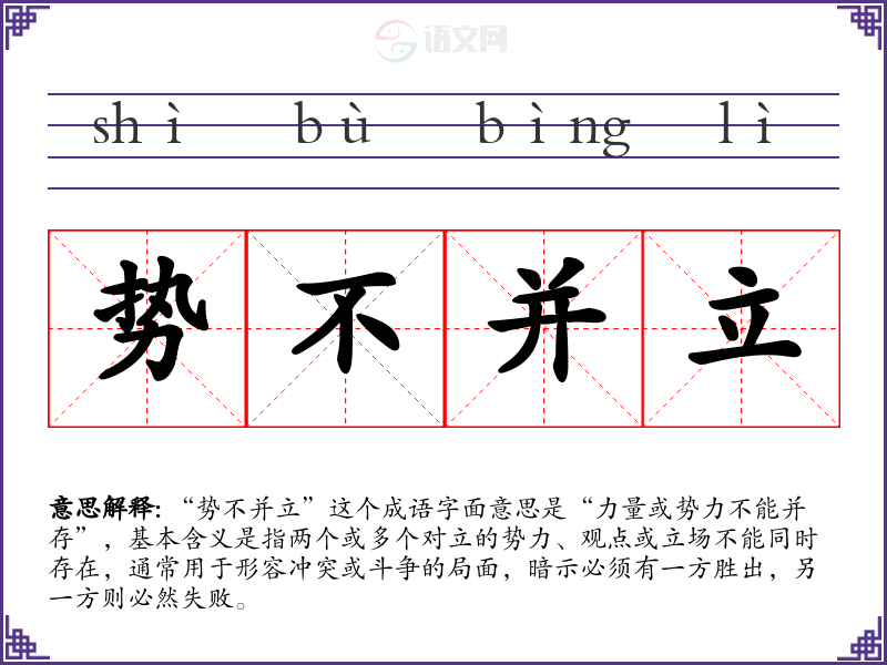 “势不并立”这个成语字面意思是“力量或势力不能并存”,基本含义是指两个或多个对立的势力、观点或立场不能同时存在,通常用于形容冲突或斗争的局面,暗示必须有一方胜出,另一方则必然失败。