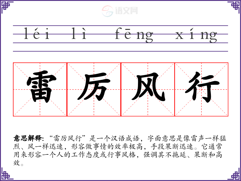 “雷厉风行”是一个汉语成语,字面意思是像雷声一样猛烈、风一样迅速,形容做事情的效率极高,手段果断迅速。它通常用来形容一个人的工作态度或行事风格,强调其不拖延、果断和高效。