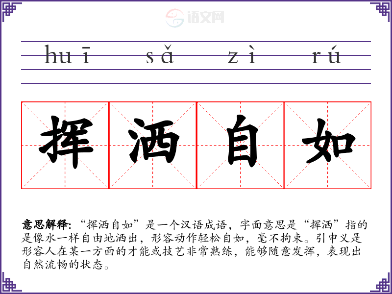 “挥洒自如”是一个汉语成语,字面意思是“挥洒”指的是像水一样自由地洒出,形容动作轻松自如,毫不拘束。引申义是形容人在某一方面的才能或技艺非常熟练,能够随意发挥,表现出自然流畅的状态。