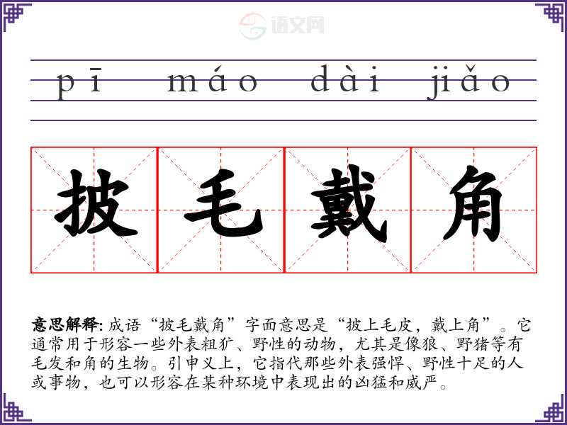 - 温文尔雅:形容人文雅、温和,与“披毛戴角”的粗犷形象形成鲜明对比。