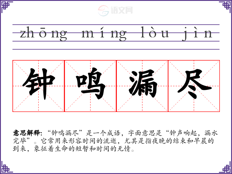 “钟鸣漏尽”是一个成语,字面意思是“钟声响起,漏水完毕”。它常用来形容时间的流逝,尤其是指夜晚的结束和早晨的到来,象征着生命的短暂和时间的无情。
