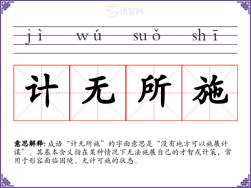 成语“计无所施”的字面意思是“没有地方可以施展计谋”。其基本含义指在某种情况下无法施展自己的才智或计策,常用于形容面临困境、无计可施的状态。