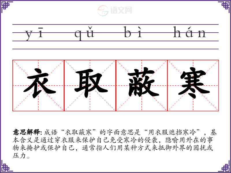成语“衣取蔽寒”的字面意思是“用衣服遮挡寒冷”,基本含义是通过穿衣服来保护自己免受寒冷的侵袭,隐喻用外在的事物来掩护或保护自己,通常指人们用某种方式来抵御外界的困扰或压力。