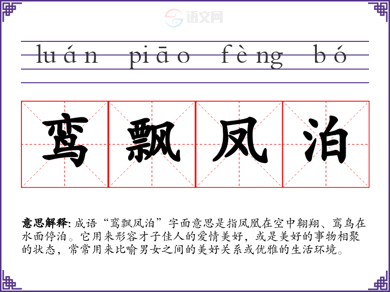 成语“鸾飘凤泊”字面意思是指凤凰在空中翱翔、鸾鸟在水面停泊。它用来形容才子佳人的爱情美好,或是美好的事物相聚的状态,常常用来比喻男女之间的美好关系或优雅的生活环境。