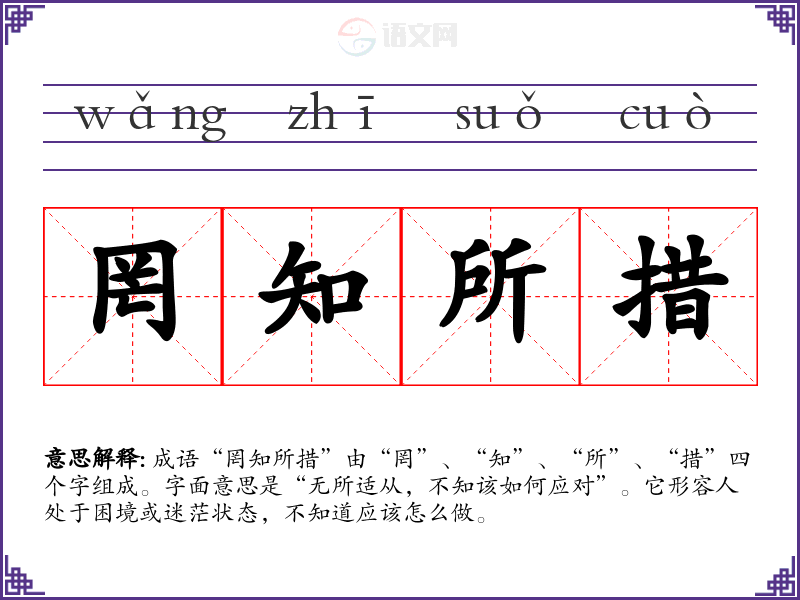 成语“罔知所措”由“罔”、“知”、“所”、“措”四个字组成。字面意思是“无所适从,不知该如何应对”。它形容人处于困境或迷茫状态,不知道应该怎么做。