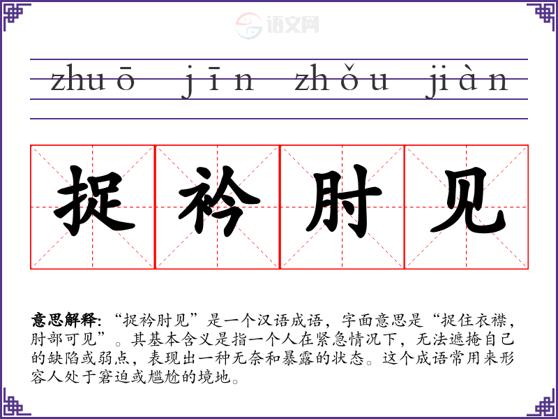 该成语源自《左传》的记载,原文是“捉衿肘见,君子于此,见其道”。其历史背景可追溯到春秋时期,反映了古代社会对品德和修养的重视。在古代,衣服的设计与个人形象息息相关,捉住衣襟意味着无法掩饰自己的缺陷,是一种无奈的表现。