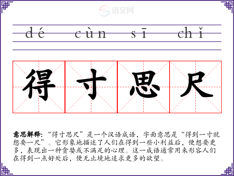 “得寸思尺”是一个汉语成语,字面意思是“得到一寸就想要一尺”。它形象地描述了人们在得到一些小利益后,便想要更多,表现出一种贪婪或不满足的心理。这一成语通常用来形容人们在得到一点好处后,便无止境地追求更多的欲望。