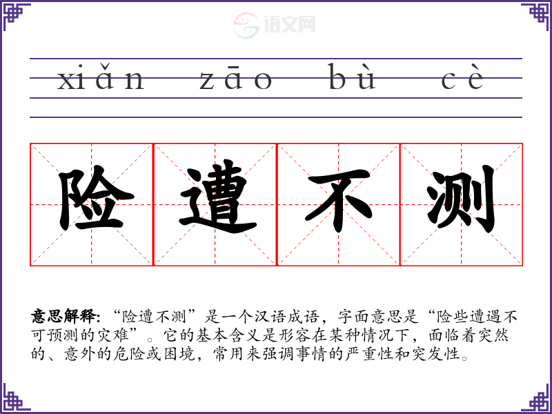 该成语的确切来源虽然没有明确的文献记载,但其构成的词汇在古代文献中就有所使用。其中,“险”表示危险、艰险,“遭”表示遭遇,“不测”则指意外发生的事情。该成语旨在传达突发性**带来的威胁感,反映了古人对不可控因素的深刻认识。