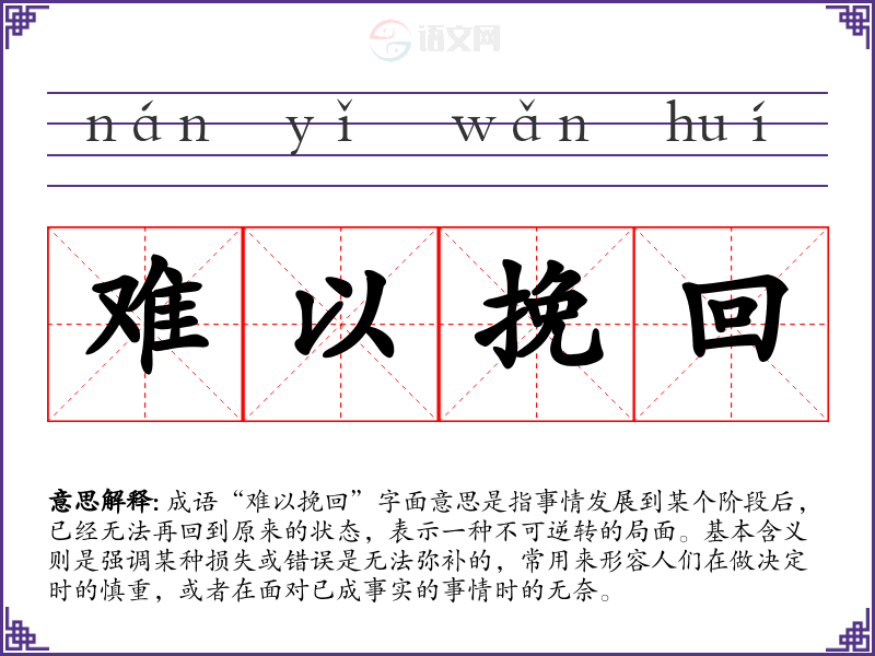 “难以挽回”并没有明确的历史典故或文学出处,但它的构成部分“挽回”常用在古代文学中,表示试图恢复、弥补的意思。成语的形成反映了人们对不可逆转现象的感慨,尤其是在历史、人生和社会变迁中,往往会有一些遗憾的事情无法再回头。