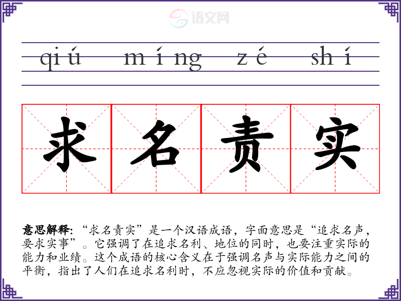 “求名责实”是一个汉语成语,字面意思是“追求名声,要求实事”。它强调了在追求名利、地位的同时,也要注重实际的能力和业绩。这个成语的核心含义在于强调名声与实际能力之间的平衡,指出了人们在追求名利时,不应忽视实际的价值和贡献。