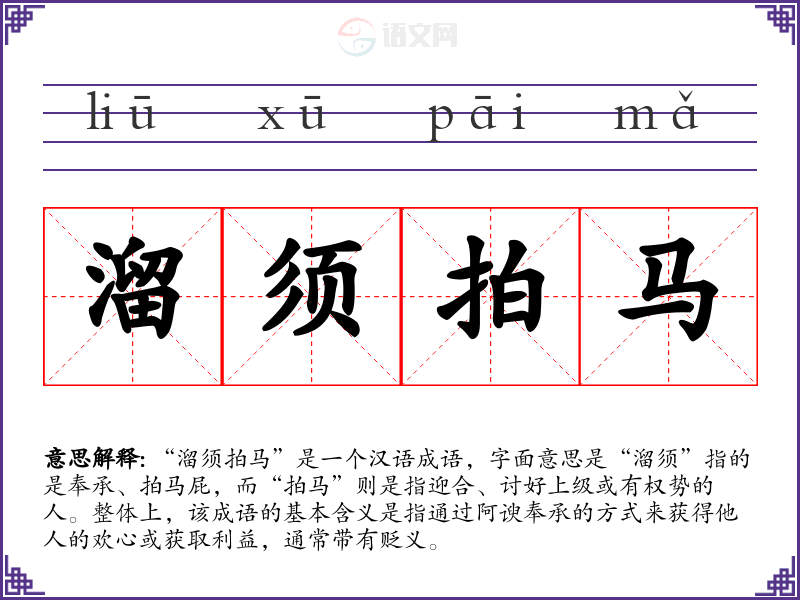 “溜须拍马”是一个汉语成语,字面意思是“溜须”指的是奉承、拍马屁,而“拍马”则是指迎合、讨好上级或有权势的人。整体上,该成语的基本含义是指通过阿谀奉承的方式来获得他人的欢心或获取利益,通常带有贬义。