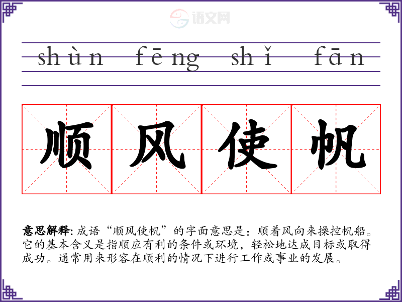 成语“顺风使帆”的字面意思是:顺着风向来操控帆船。它的基本含义是指顺应有利的条件或环境,轻松地达成目标或取得成功。通常用来形容在顺利的情况下进行工作或事业的发展。