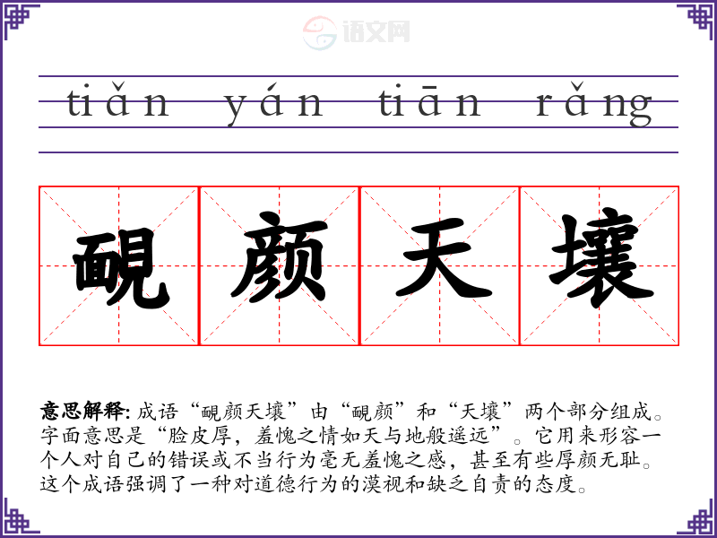 成语“靦颜天壤”由“靦颜”和“天壤”两个部分组成。字面意思是“脸皮厚,羞愧之情如天与地般遥远”。它用来形容一个人对自己的错误或不当行为毫无羞愧之感,甚至有些厚颜无耻。这个成语强调了一种对道德行为的漠视和缺乏自责的态度。