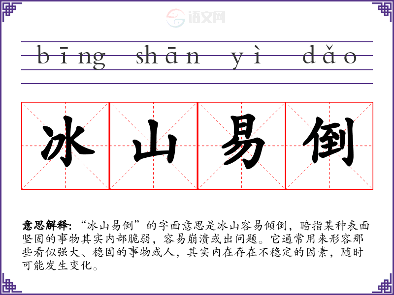 “冰山易倒”并没有明确的历史典故或文学出处,可能是现代汉语中常用的表达,结合了冰山的形象和倒下的状态。冰山的坚硬和巨型给人一种威严和稳定的感觉,但实际上,冰山的根基往往是脆弱的,只有一小部分露出水面,潜在的巨大体积和结构隐藏在水下。
