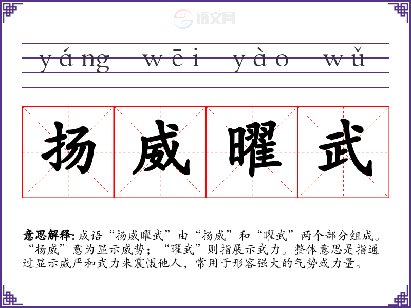 成语“扬威曜武”由“扬威”和“曜武”两个部分组成。“扬威”意为显示威势;“曜武”则指展示武力。整体意思是指通过显示威严和武力来震慑他人,常用于形容强大的气势或力量。