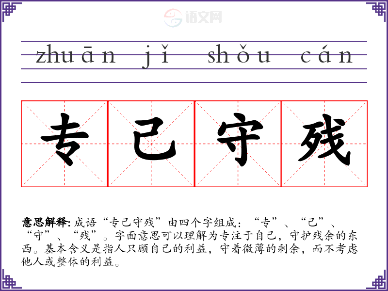 成语“专己守残”由四个字组成:“专”、“己”、“守”、“残”。字面意思可以理解为专注于自己,守护残余的东西。基本含义是指人只顾自己的利益,守着微*的剩余,而不考虑他人或整体的利益。
