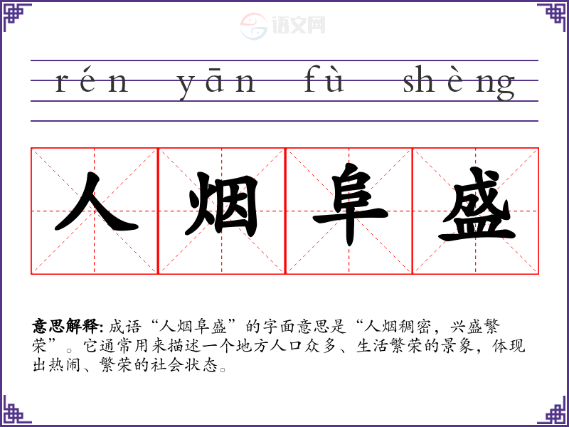 成语“人烟阜盛”的字面意思是“人烟稠密,兴盛繁荣”。它通常用来描述一个地方人口众多、生活繁荣的景象,体现出热闹、繁荣的社会状态。