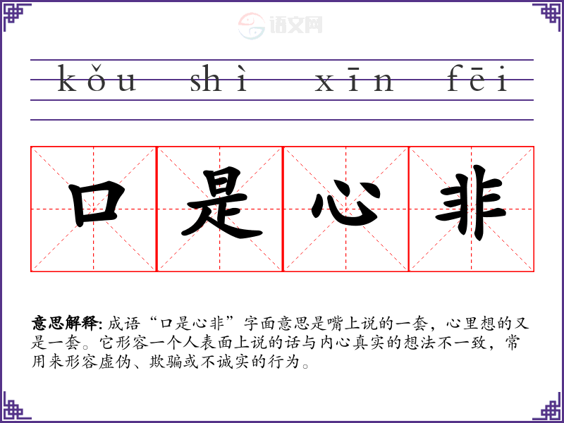成语“口是心非”字面意思是嘴上说的一套,心里想的又是一套。它形容一个人表面上说的话与内心真实的想法不一致,常用来形容虚伪、欺骗或不诚实的行为。