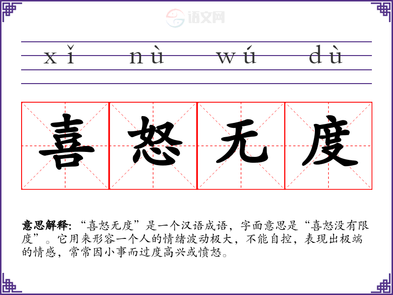 “喜怒无度”是一个汉语成语,字面意思是“喜怒没有限度”。它用来形容一个人的情绪波动极大,不能自控,表现出极端的情感,常常因小事而过度高兴或愤怒。