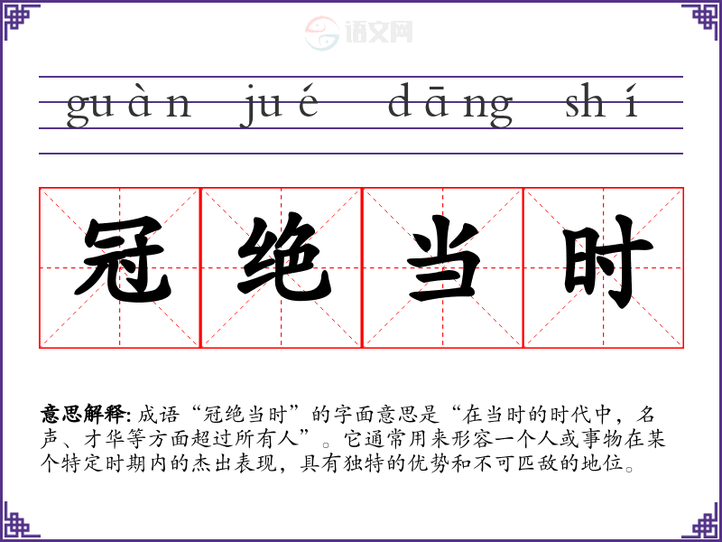 成语“冠绝当时”的字面意思是“在当时的时代中,名声、才华等方面超过所有人”。它通常用来形容一个人或事物在某个特定时期内的杰出表现,具有独特的优势和不可匹敌的地位。